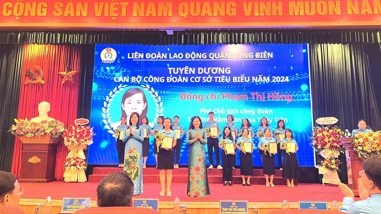 Tại hội nghị, đồng chí Phạm Thị Hồng- Phó chủ tịch công đoàn trường mầm non Hoa Thuỷ Tiên vinh dự là 1 trong 95 cán bộ công đoàn tiêu biểu được LĐLĐ quận Long Biên tuyên dương, khen thưởng.