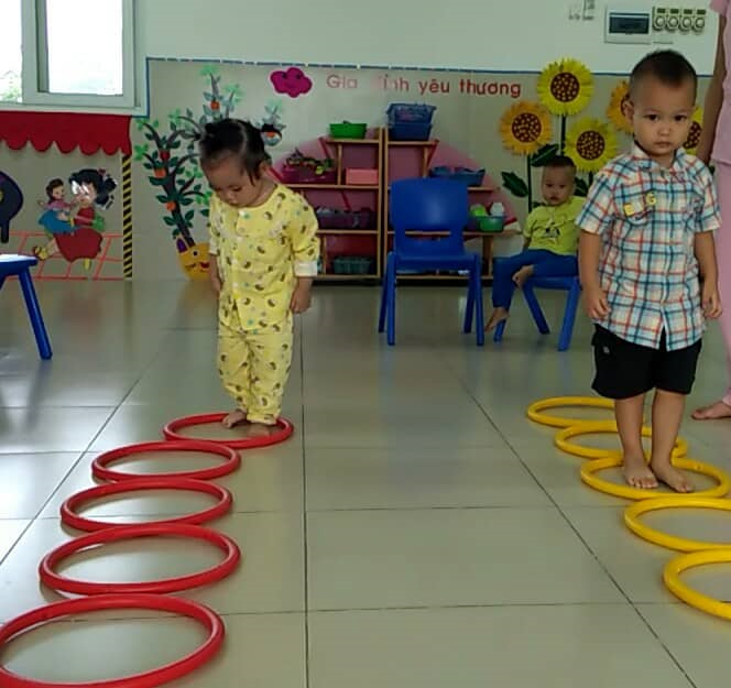 Với mục đích nâng cao sức khỏe, sự bền bỉ của đôi chân các cô gíao lớp nhà trẻ D2 đã cho các bé được tham gia vận động với đề tài : " Đi bước vào vòng thể dục" .