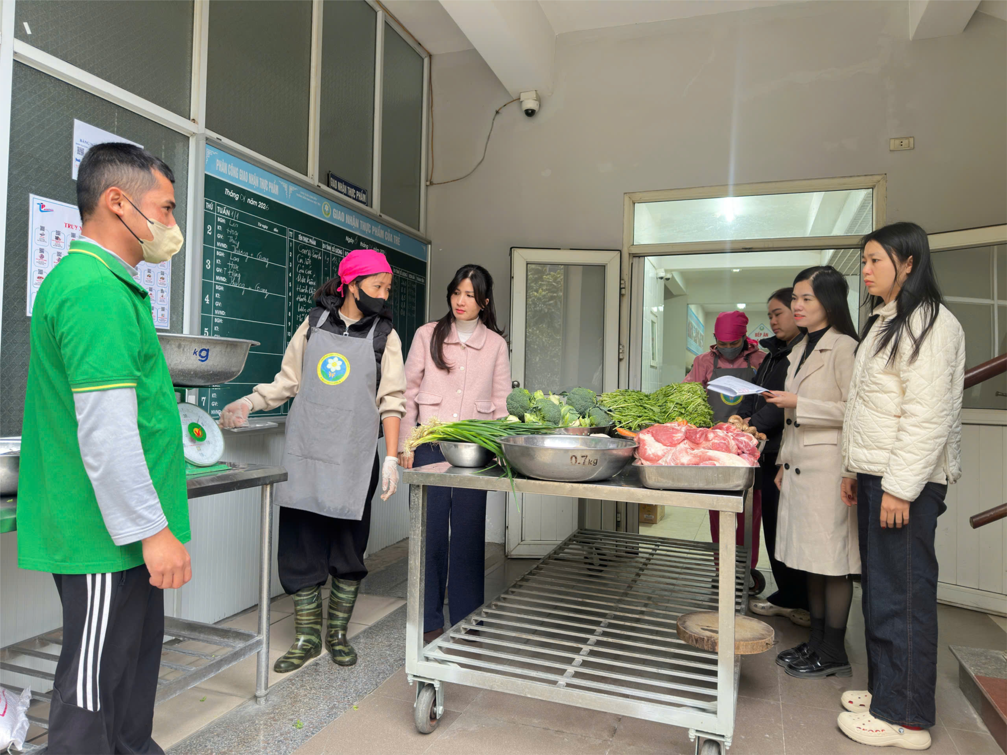 Hằng ngày, nhà trường thực hiện việc tiếp nhận thực phẩm theo đúng quy trình, đảm bảo nguồn gốc rõ ràng, chất lượng tươi ngon và an toàn vệ sinh thực phẩm. Các loại thực phẩm được lựa chọn từ những đơn vị cung ứng uy tín, có đầy đủ hồ sơ pháp lý theo quy định. Quá trình giao nhận được tiến hành công khai, minh bạch, có sự kiểm tra, giám sát chặt chẽ của ban giám hiệu, nhân viên nuôi dưỡng và các bộ phận liên quan.