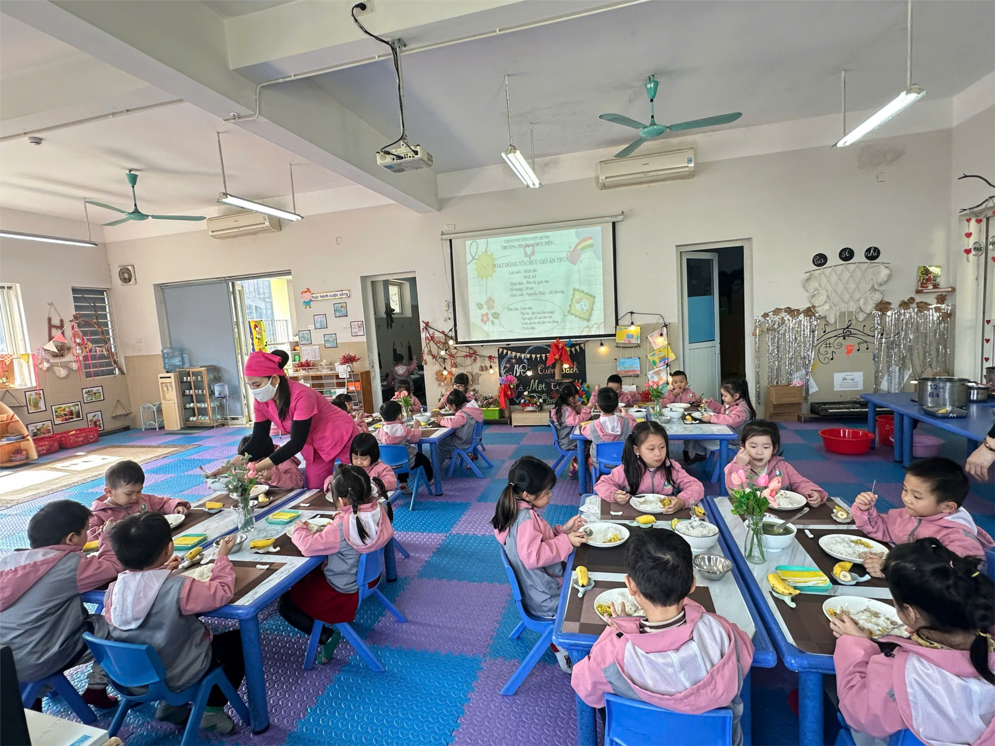 Nhằm nâng cao chất lượng chăm sóc, nuôi dưỡng trẻ trong trường mầm non, Trường Mầm non Hoa Thuỷ Tiên đã tổ chức chương trình kiến tập cấp trường với nội dung “Hoạt động giờ ăn trưa của trẻ”, được thực hiện theo hình thức bữa ăn giao lưu giữa hai lớp.