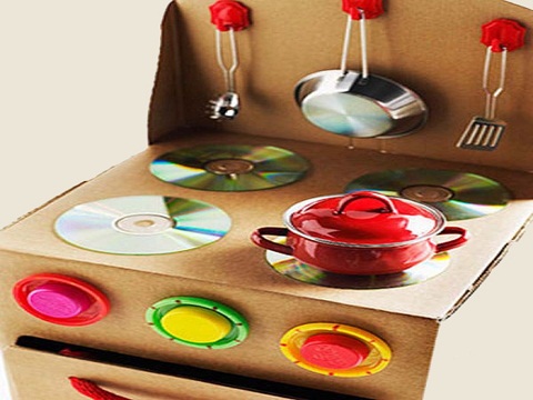 Bước 2: Sau đó, lấy đĩa CD cũ dán lên bề mặt thùng để làm bếp. Các mẹ dựa vào diện tích tấm bìa để làm số lượng bếp sao cho hợp lý.