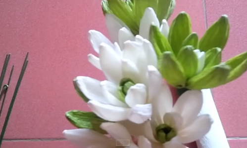 Bước 4: Buộc thắt nút chỉ thật chắc chắn rồi dùng kéo cắt. Dùng băng dính dán quanh phần đế hoa để cho chắc chắn, và ta đã có một bông hoa mộc lan bằng giấy nhún hoàn chỉnh (15p01s)