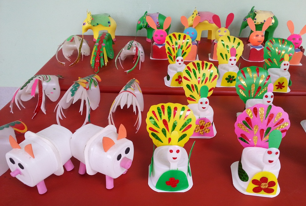 - Bước 2: Cô dùng xốp tạo hình cắt ghép những bộ phận như ảnh minh họa. Tiếp theo Cô dùng hồ dán và gắn chúng lên những chiếc hộp để hoàn thành tác phẩm.