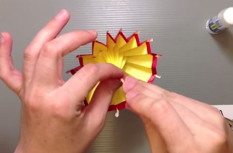 Bước 14: Phết keo và gắn phần giấy màu vàng vừa gấp lên phần ô màu đỏ sao cho các nếp gấp của hai phần trùng khít nhau. (20:39)