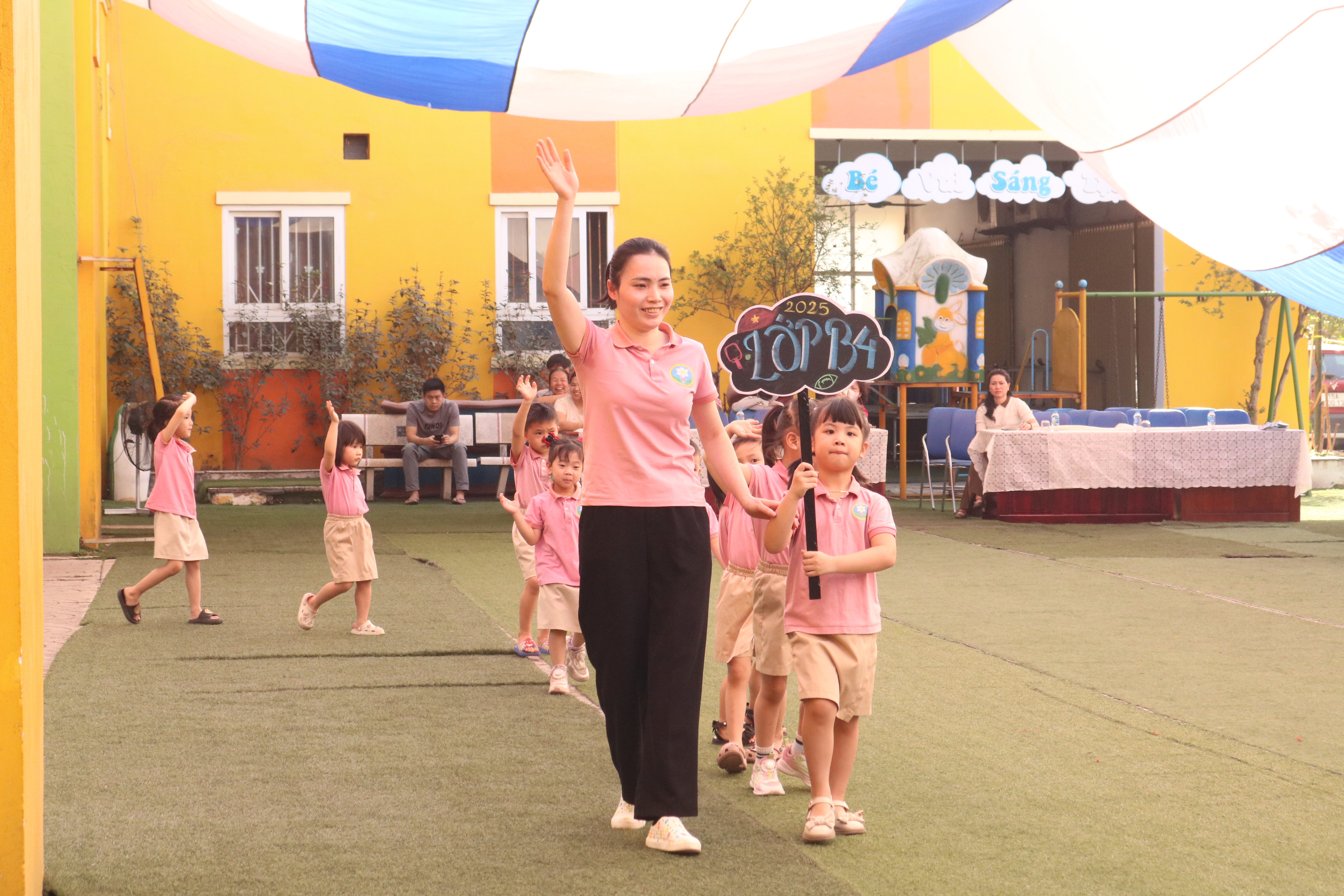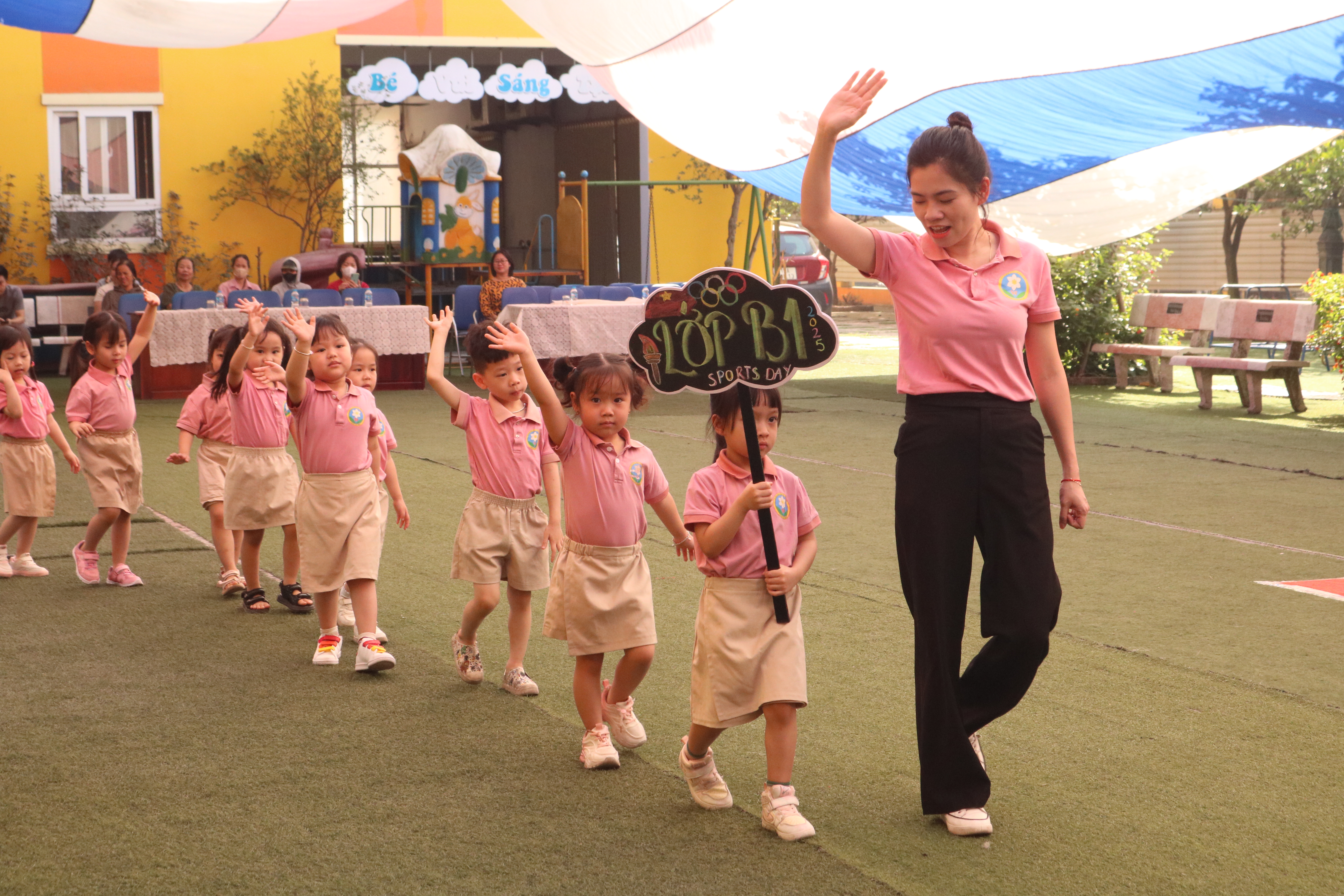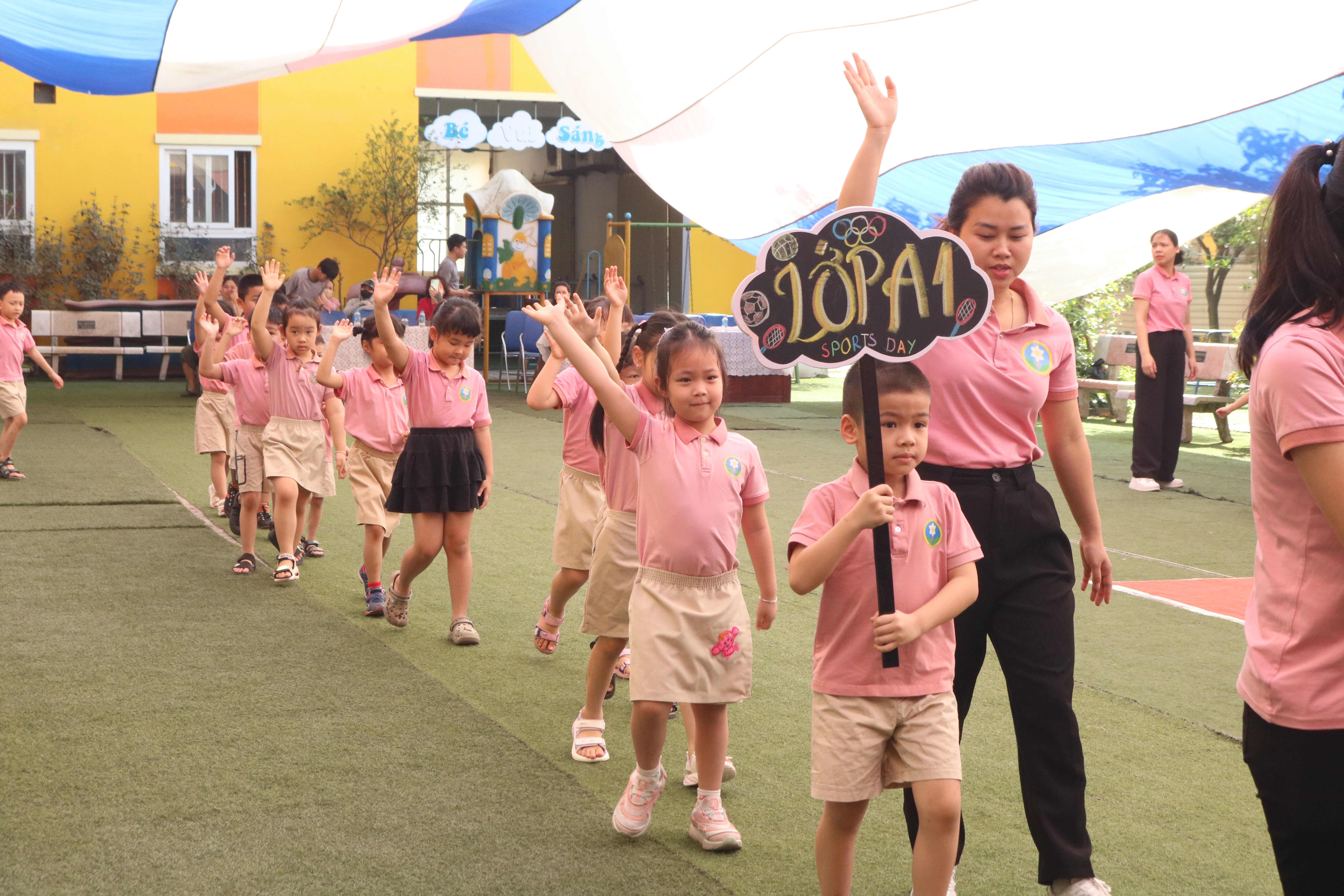 Chương trình diễn ra trong không khí vui tươi, náo nức với sự tham gia đầy đủ của các bé thuộc ba khối lớp: Bé – Nhỡ – Lớn. Mở đầu ngày hội là nghi thức rước cờ, rước đuốc Olympic, diễu hành các lớp và phần phát biểu khai mạc từ cô Hiệu trưởng Nguyễn Thị Thu Trang. Những hình ảnh chỉn chu, nghiêm túc của các bé khiến không khí buổi lễ thêm phần trang trọng và đáng nhớ.