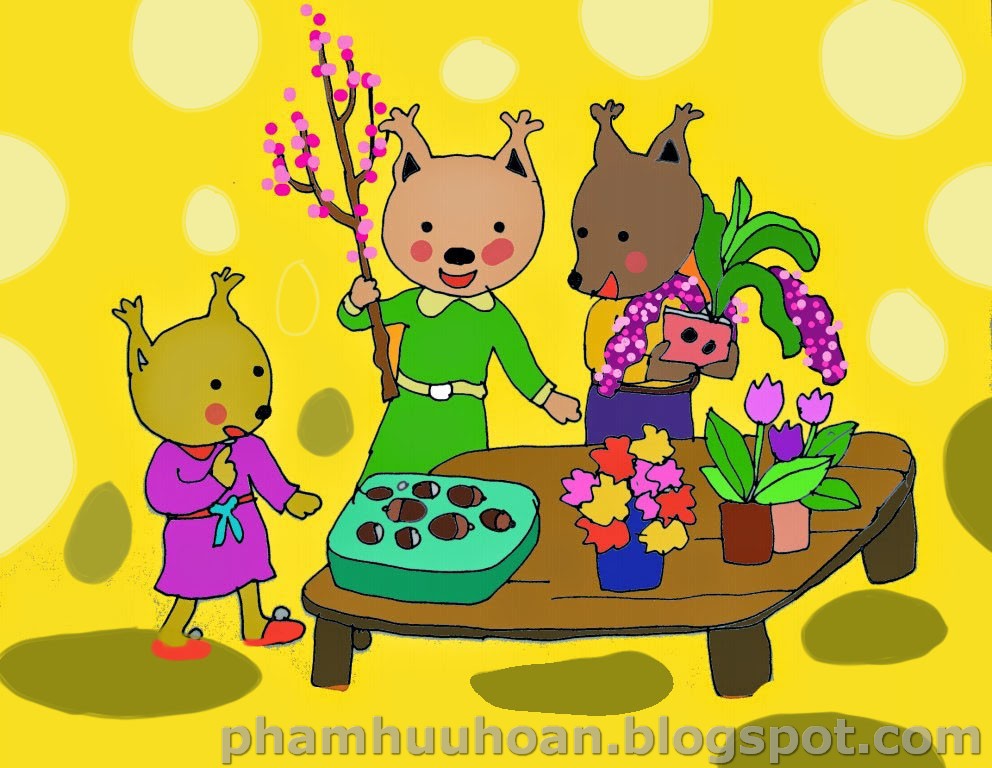 Hội hoa thật đẹp. Sóc mẹ mua một cành đào, Sóc bố chọn Hoa phong lan. Sóc con nhìn hết loại hoa này đến hoa khác, hoa nào cũng đẹp. Sóc lưỡng lự chẳng biết chọn loại hoa nào...Sóc mẹ nhìn Sóc con âu yếm:
