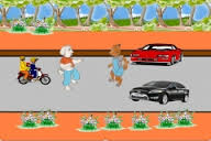 - Cún Em ơi! Mẹ dặn chúng mình đi sát lề đường bên phải kia mà, sao em lại đi giữa lòng đường thế kia?